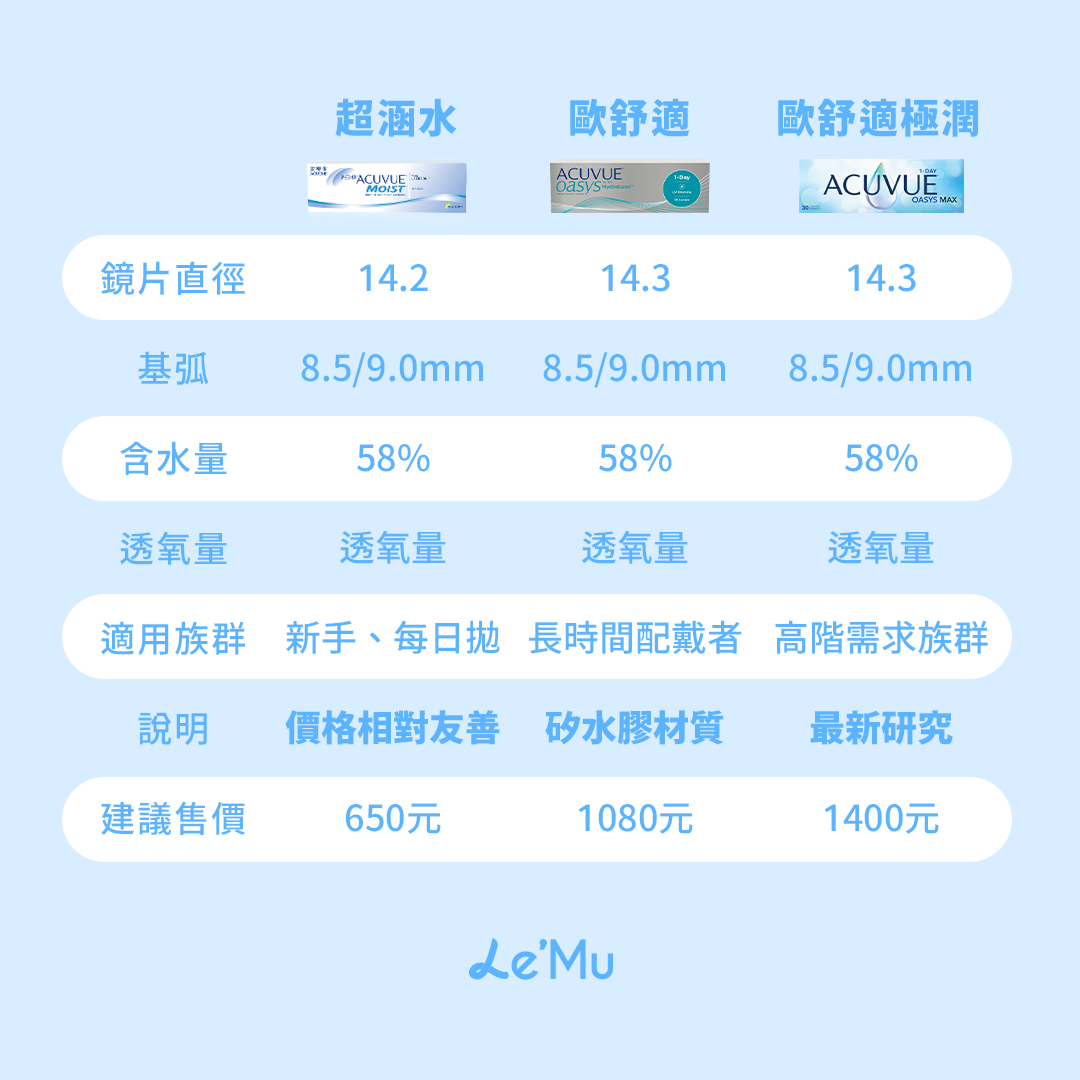 歐舒適每日拋:進化款每日矽水膠鏡片,適合長時間配戴或螢幕族群。